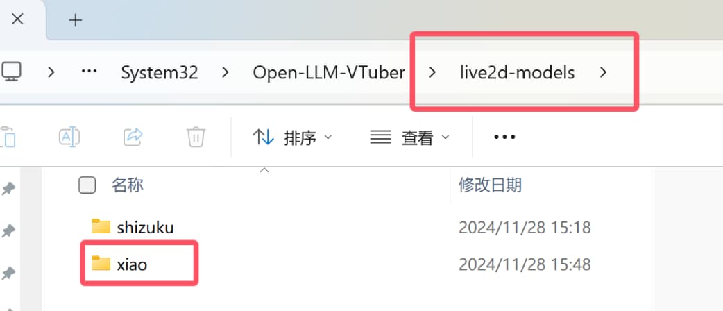 将你的 Live2D 模型文件放在 live2d-models 文件夹中,如图中的 xiao。